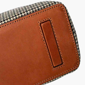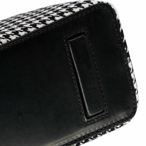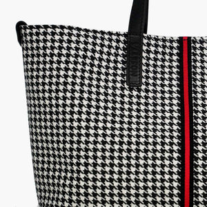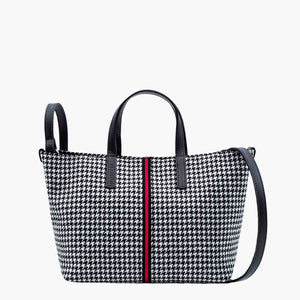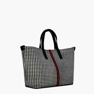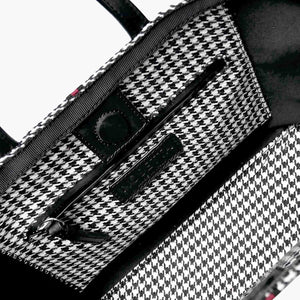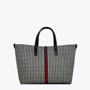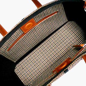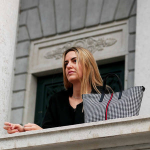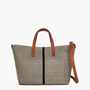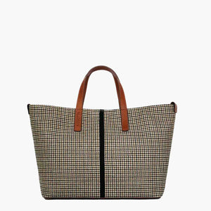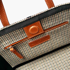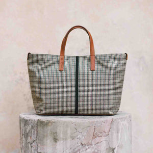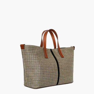 Lightweight tote made with the highest quality Italian wool with cotton backing. Contrast Italian ribbon trim in the center of bag. Italian leather handles, detachable shoulder strap, base and trimmings. Two interior pockets, one with zip and one open pocket.