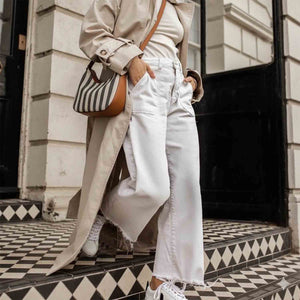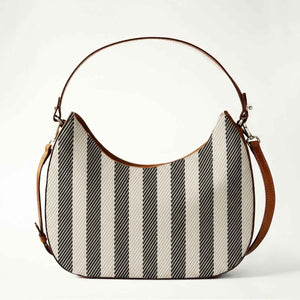 Lightweight hobo with a metal zip closure and 1 interior open pocket. Luxury Stripe Twill with cotton a natural twill lining and Italian vachetta leather trimmings.