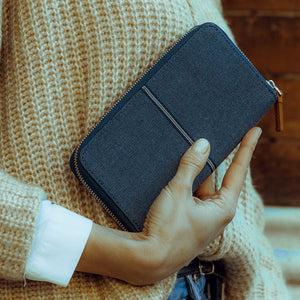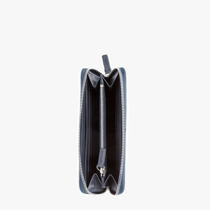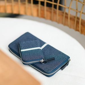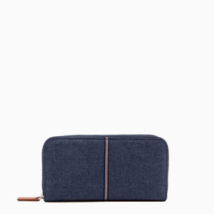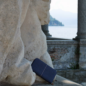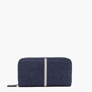 Notre portefeuille zippé est fait de denim italien de qualité supérieure avec une légère structure. Ruban italien emblématique. Intérieur à deux compartiments en cuir au tannage végétal avec douze emplacements pour cartes, deux poches pour billets et une poche intérieure zippée.