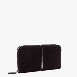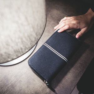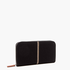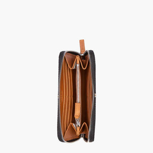 Il nostro portafoglio con cerniera zip completa è realizzato in Canvas di Cotone di qualità superiore molto resistente. La parte interna è in pelle a concia vegetale con due scomparti, dodici spazi per carte di credito e tessere, due aree per le banconote e una tasca con zip per le monete.